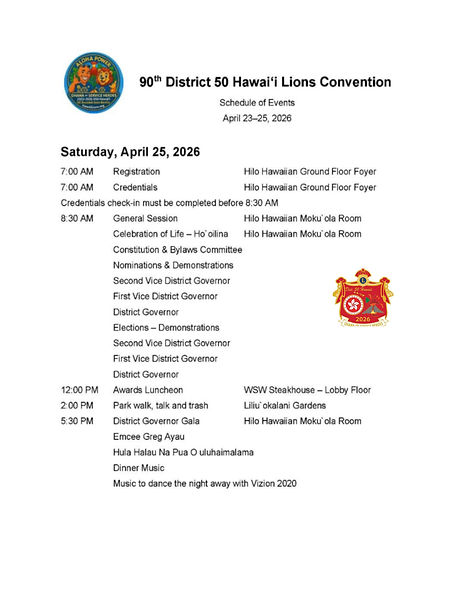 Lions from across Hawai‘i gather in Hilo for the annual District 50 Hawai‘i Lions Convention — a meaningful weekend of Service, Leadership, Celebration, and Aloha. This special event brings together our Lions Big ‘Ohana for essential business sessions including the District Cabinet Meeting, elections, and presentations from club and district leaders. Enjoy a weekend full of tradition and fellowship with highlights such as a golf tournament, a beautiful Flag Ceremony, a spirited Fun Night hosted by our Leos and Hilo Crescent City Young Visionaries, and an inspiring Keynote Address by a Past International President of Lions Clubs International. The convention also features recognition and awards ceremonies honoring outstanding service across our district. We conclude the festivities with the District Governor’s Gala — a night of celebration, unity, and pride as we reflect on our achievements and look forward to the year ahead.